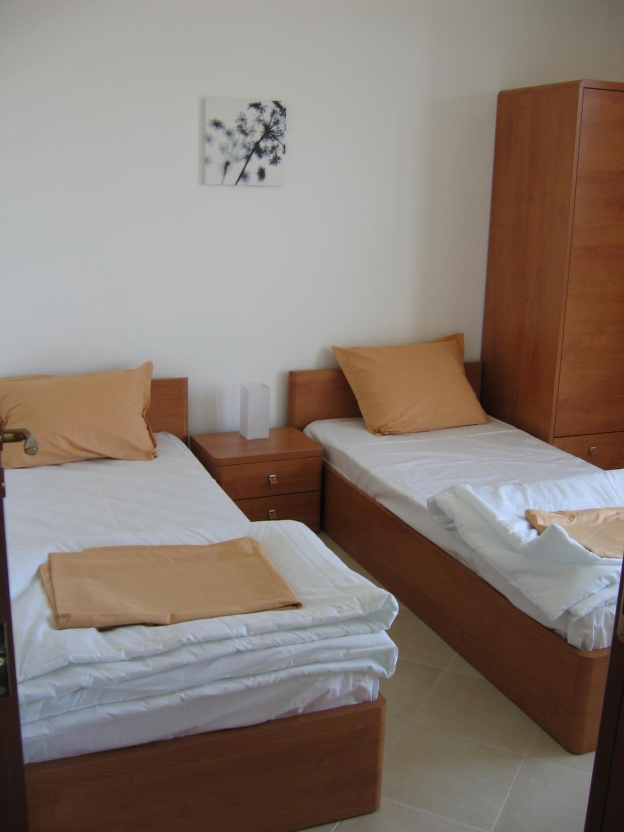 Two single beds, a wordrobe and set of drawers.